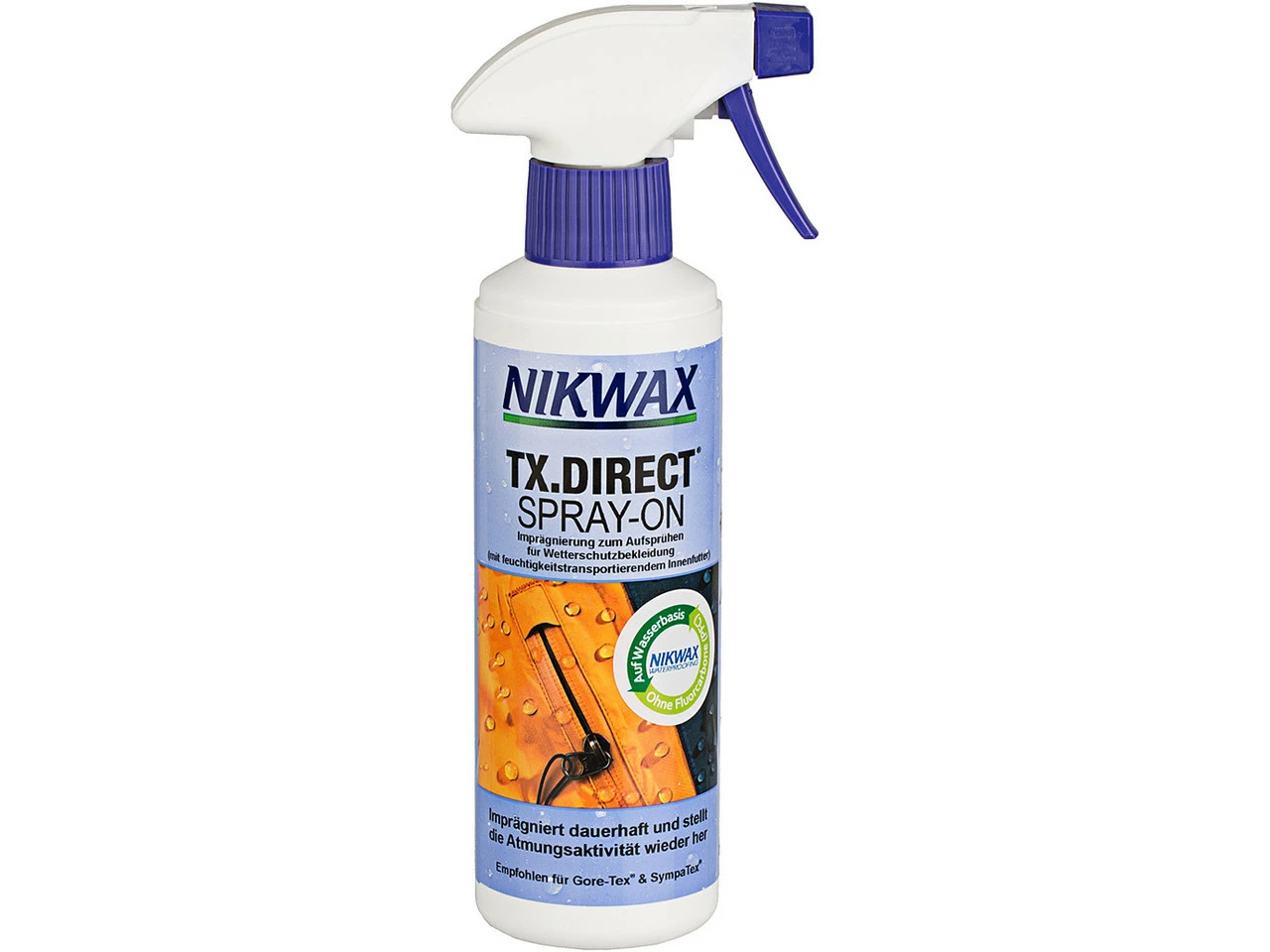 Aufsprühbare Imprägnierung auf Wasserbasis für Bekleidung mit Wetterschutzmembran. Verfügt über dauerhaft wasserabweisende Wirkung, stellt die Atmungsaktivität wieder her und erhält die internen feuchtigkeitstransportierenden Eigenschaften. Nikwax TX Direct Spray-On ist einfach und schnell anzuwenden, und seine hochgradige dauerhaft wasserabweisende Eigenschaft (DWR) bildet sich während des Lufttrocknens. Das Trocken im Wäschetrockner wird überflüssig. So sparst Du Energie und schützt empfindliche, ältere Kleidung vor Hitze. Nikwax TX Direct Spray-On wurde speziell für atmungsaktive, wasserdichte Kleidung entwickelt und optimiert. Es hinterlässt eine flexible, wasserabweisende Schicht auf einzelnen Fasern, sodass Feuchtigkeit beim Verdunsten durchgelassen und die Atmungsaktivität erhalten wird. Die Sprüh-Imprägnierung ermöglicht das gezielte Behandeln von beanspruchten Stellen (z.B. Ellenbogen und Jackennähte), ohne dabei die Eigenschaften des feuchtigkeitstransportierenden Innenfutters zu beeinträchtigen.